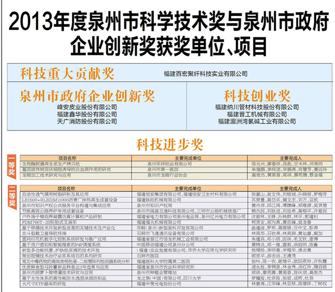Selection of activities to meet the reporting requirements of the project received a total of 243, after the project application, the form of review, publicity and expert group review and other sectors, and the Municipal Science and technology award evaluation committee after the audit, the final results of the review: "the birth of Fujian billion polymerization fiber Industrial Co., Ltd." was awarded the Quanzhou Municipal Science and Technology Award for significant contributions to "peak ANN; leather industry Limited by Share Ltd" and other 3 companies awarded the city government enterprise innovation award; "Fujian Nachuan pipe Polytron Technologies Inc" and other 3 companies awarded "Quanzhou science and technology innovation award. In addition, because this year the declaration of the Quanzhou prize for progress in science and technology project quantity, higher quality, scientific and technological progress awards and patent prize number were increased to 55 and 27.